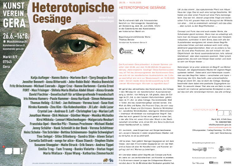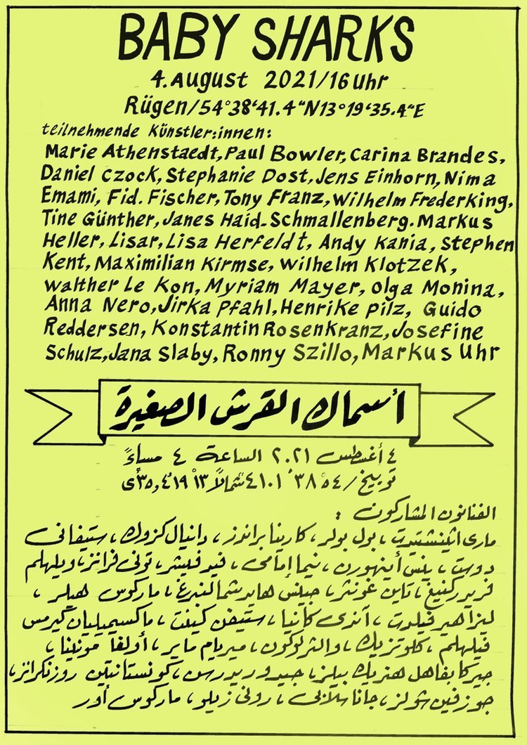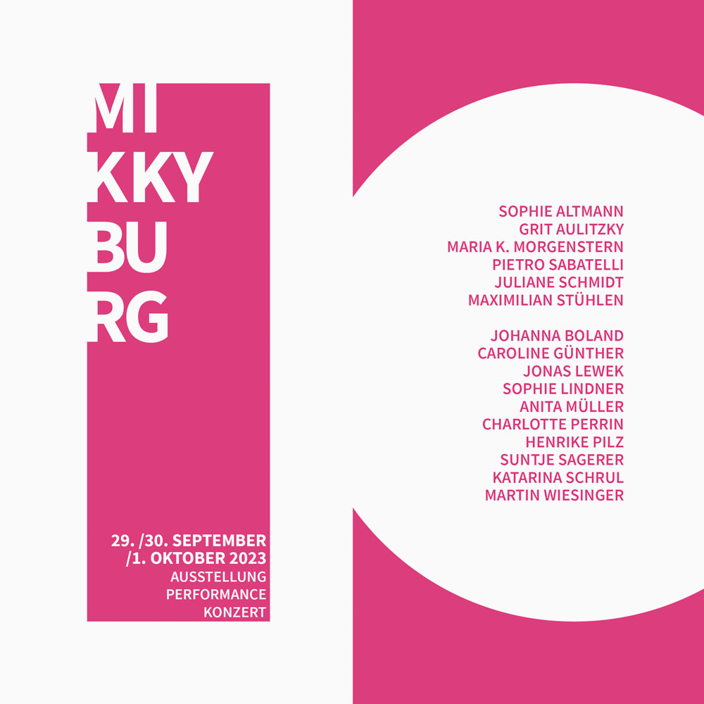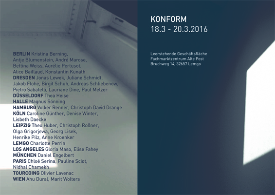 Katja Aufleger, Hanns Bahra, Marlene Bart, Tjorg Douglas Beer, Jennifer Bennett, Anna Bittersohl, John-Robin Bold, Monica Bonvicini, Fritz Brinckmann, Michael Conrads, Jigger Cruz, Hanne Darboven, Carola Ernst, FORT, Max Frisinger, Shitela Maria Biallas Abdel Ghani, Alexa Grande, David Fletcher, Gesellschaft für artübergreifende Freundschaft, Iris Helena Hamers, Paule Hammer, Anna Hartlaub, Simon Hehemann, Thomas Helbig, DJ Hell, Jan Holtmann, Verena Issel, Suse Itzel, Hiroku Kameda, Zinu Kim, Ilia Kobeshavidze, Jil Lahr, Anik Lazar, Crystal Lee, Andreas O. Loff, Christopher Loy, Marian Luft, Jonathan Meese, Dirk Meinzer, Günther Meyer, Monika Michalko, Kirsi Mikkola, Lennart Münchenhagen, Malgorzata Neubart, Franziska Opel, Henrike Pilz, Thomas Prochnow, Michael Riedel, Jenny Schäfer, Hank Schmidt in der Beek, Verena Schöttmer, Heinz Schoke, Tim Schröder, Bettina Schünemann, Sophie Schweighart, Tino Sehgal, Silke Silkeborg, Sandra Slim, Aleen Solari, Cornelia Sollfrank, songs for alice, Klaus Staeck, Stephen Stahn, Susanne Stoeppler, Malte Struck, Erik Swars, Andrea Tippel, Emilia Trog, Tam Truong, Banks Violette, Stefan Vogel, Maria Wallace, Xiyao Wang, Katharina Zimmerhackl