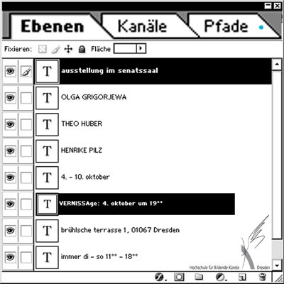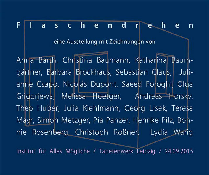 Tom Ackermann | Sophie Altmann | Jantje Almstedt | Marie Aly | Charlotte Antony | Myrsini Artakianou | Marie Athenstaedt | Christina Baumann | Enrico Bach | Bella Bram | Georg Brückmann | Tim Cierpiszewski | Dana László da Costa | Janosch Dannemann | Franziska Degendorfer | Benjamin Dittrich | Lauriane Dine | Nicolás Dupont | Isabelle Dutoit | Stefan Fischer | Matthias Geisler | Alexander Gherke | Sebastian Gögel | Lenia Hauser | Ingo Albrecht Hauser | Franziska Holstein | Sebastian Hosu | Theo Huber | Tobias Hild | Stephan Jäschke | Yvette Kiessling | Trevor Kiernander | Falko Kitsche | Alexander König | Susanne Langbehn | Moritz Liebig | Johannes Listewnik | Jana Luck | Juliane Mahler | Ani Maisuradze | Klara Meinhardt | Thomas Moecker | Penny Monogiou | Johannes Myller | Eileen Almarales Noy | Lisa Pahlke | Seung Lok Paik | Henrike Pilz | Marta Pohlmann-Kryszkiewicz | Philipp Putzer | Johannes Rochhausen | Christoph Roßner | Jurek Rotha | Theresa Rothe | Mischa Sanders | Nele Hendrjke Sandner | Johan Schäfer | Florian Schurz | Josefine Schulz | Matti Schulz | Ralph Schulz | Stefan Schwarzer | Mascha Schultz | Björn Siebert | Oliver Stäudlin | Marlen Tennigkeit | Kathrin Thiele | Ruth Unger | Matthias Jun Wilhelm | Verena Winkelmann | Daniel Wogenstein | Paula Franziska Wolber