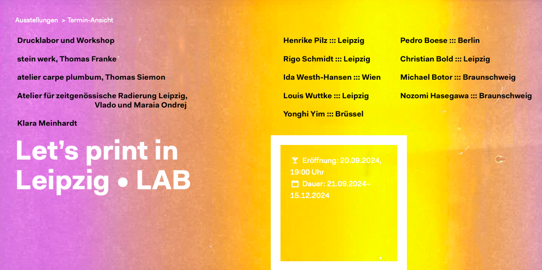 In Kooperation mit drei Leipziger Druckwerkstätten (stein_werk. Werkstatt für Lithografie und Buchdruck / Thomas Franke, Atelier für zeitgenössische Radierung Leipzig / Maria Ondrej, atelier carpe plumbum / Thomas Siemon) und der Leipziger Cyanotypie-Künstlerin Klara Meinhardt geht die Zusammenarbeit mit dem Museum für Druckkunst in die siebte Runde.